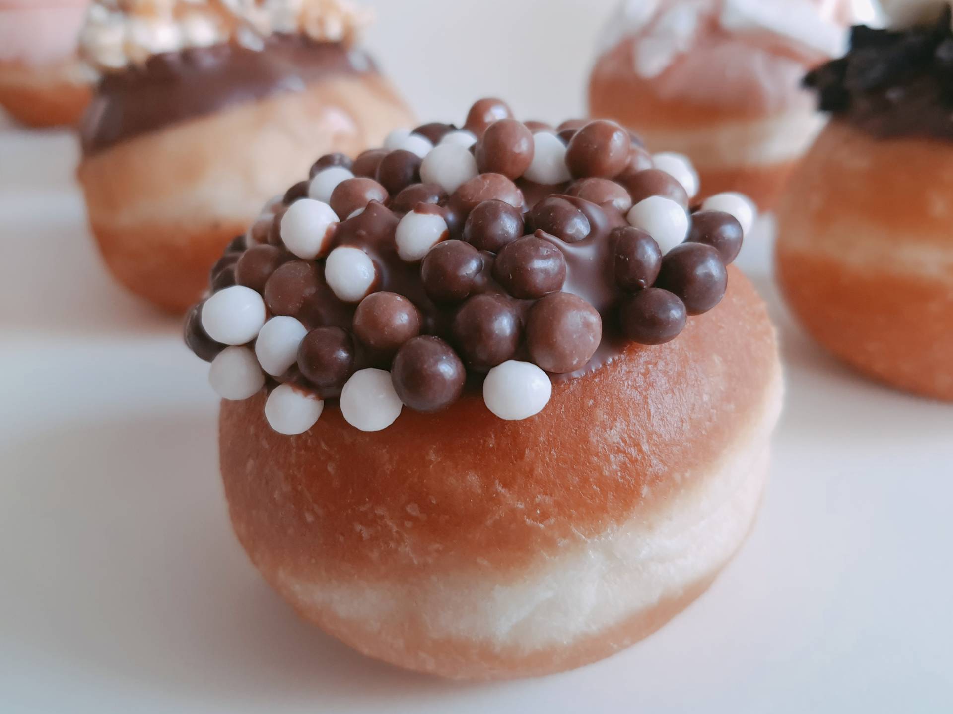 מעבירים את הקרם לשקית זילוף, מזלפים לתוך הסופגניות, טובלים את הסופגניות בשוקולד המומס, ומקשטים בכדורי שוקולד קרנצ'.