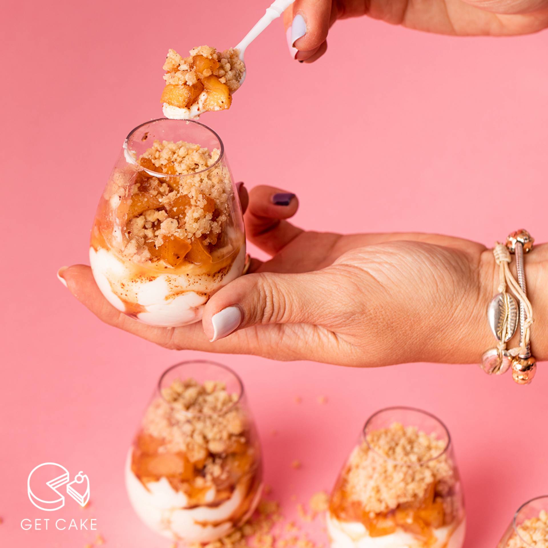 נזלף במיני כוסות מהקרם עד לחצי הגובה, נוסיף בערך כף של תפוחים מעל הקרם לכיסוי מלא ונפזר מעל מהקראמבל.