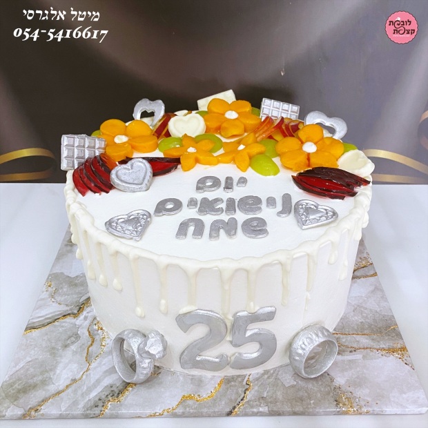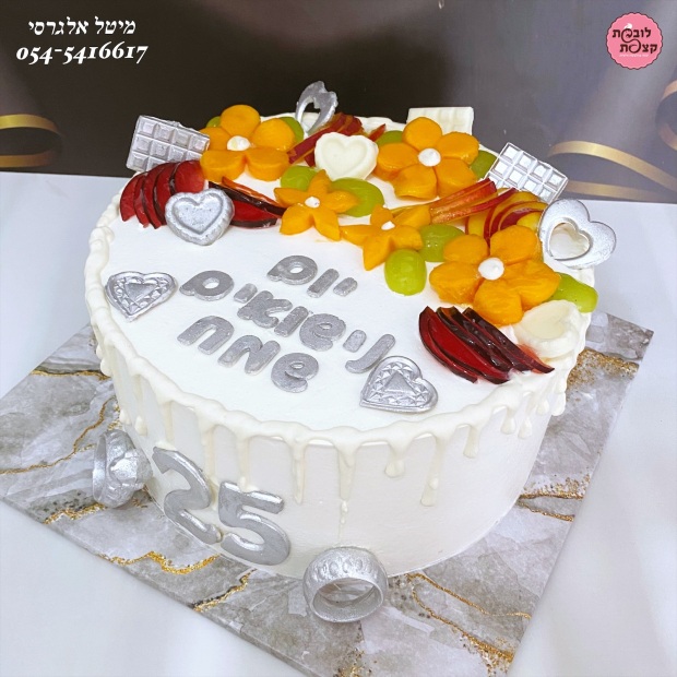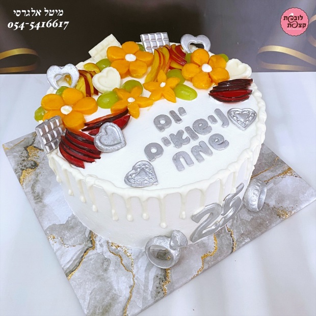 עוגה מעוצבת ליום נישואים בשילוב חיתוכי פירות