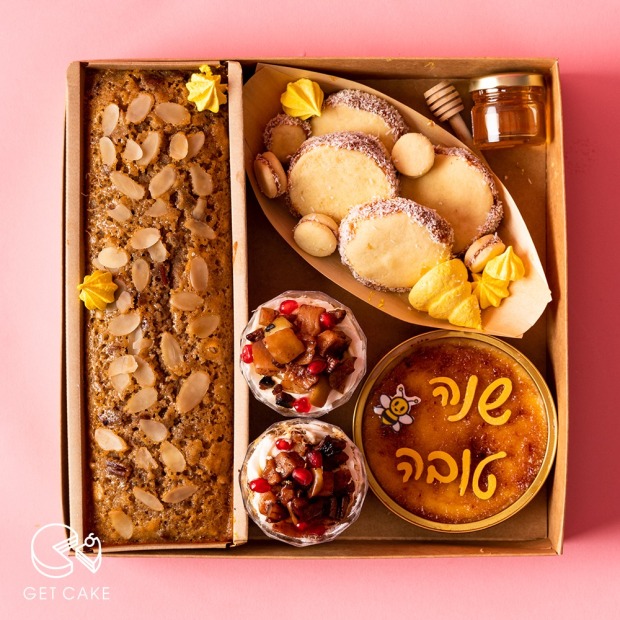 מארז משולב הכולל: עוגת פס דבש עם פקאן, קינוח קרם ברולה, שתי כוסות קינוח עם שכבות קדאיף קרם וניל ותפוח עץ מקורמל , סירת עוגיות אלפחורס, צנצנת דבש קטנה ונשיקות מרנג