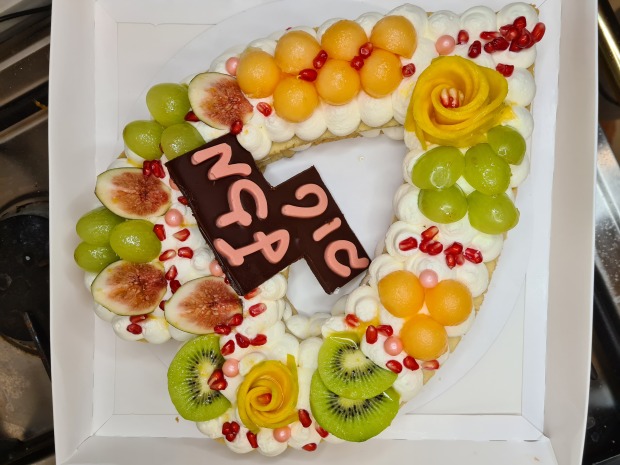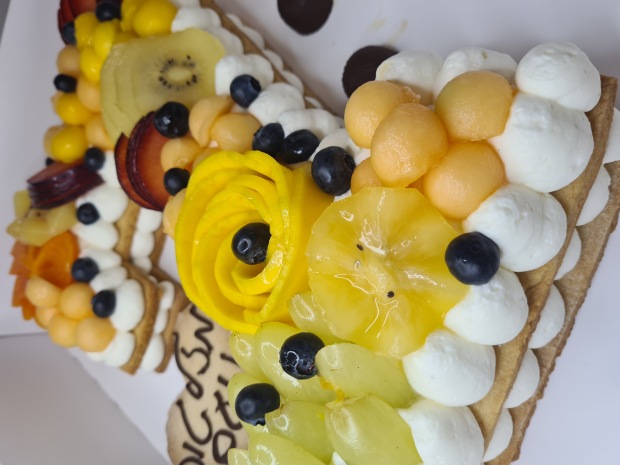 עוגת מספרים ו/או צורה מבצק פריך נימוח בשילוב קמח שקדים בשילוב פירות העונה ושוקולד עבודת יד משוקולד איכותי