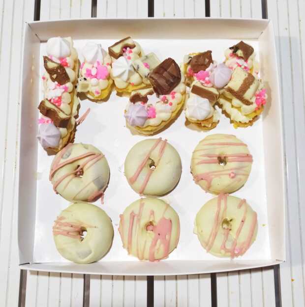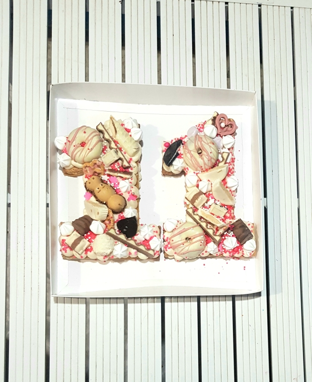 קרם וניל על אותיות מבצק פריך מעוטרים בממתקי שוקולד בצירוף מיני דונאטס מצופים שוקולד לבן