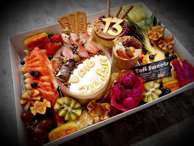 מגש משולב פירות ו4 עוגות מוס בגדלים שונים. מארז גודל 30*40 - 450 שח