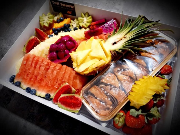 מגש משולב פירות ועוגת שמרים בטעמים לבחירה. מארז גודל 30*40 - 330 ש"ח