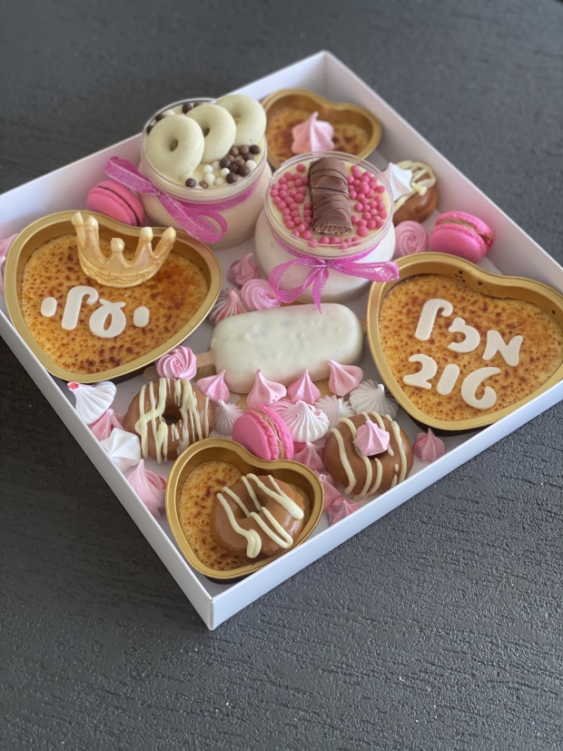 מארז מפנק הכולל קרם ברולה, מגנום, דונאטס, מקרונים ונשיקות מרנג