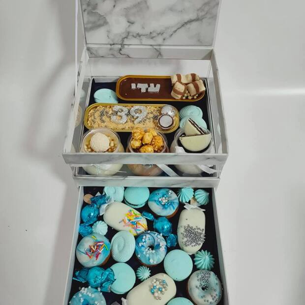 מארז מפנק הכולל: מוסים בטעמי שונים, מיני דונאטס,נשיקות.מיני מגנום, מקרונים.