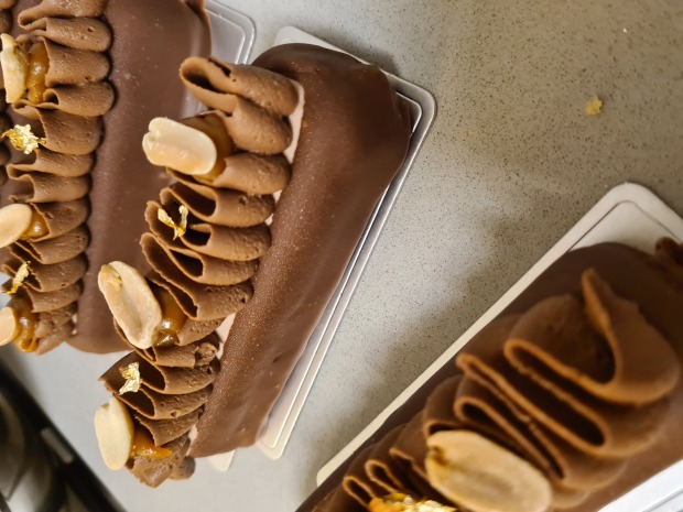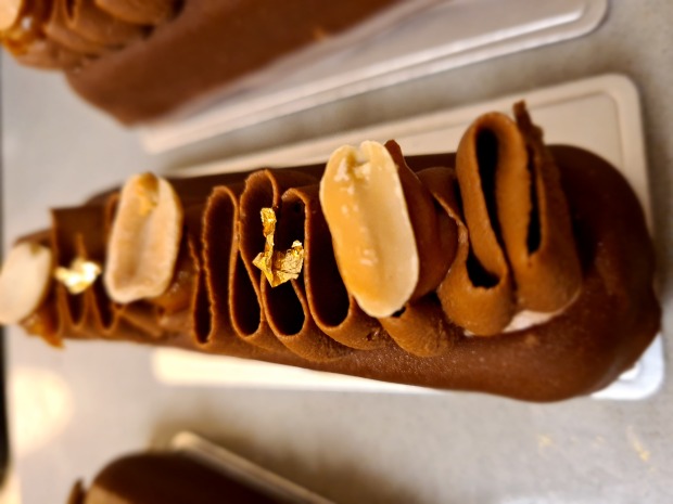מוס שוקולד חלב, בוטנים קלויים וטופי קרמל על בסיס חמאת בוטנים ונוגט
