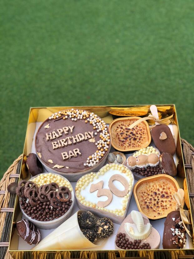 המארז כולל עוגה בתבנית קריסטל קוטר 16, מוסים בגדלים וטעמים משתנים, 2 קרם ברולה קטנים כדורי שוקולד, 2 מגנומים, דונאטסים