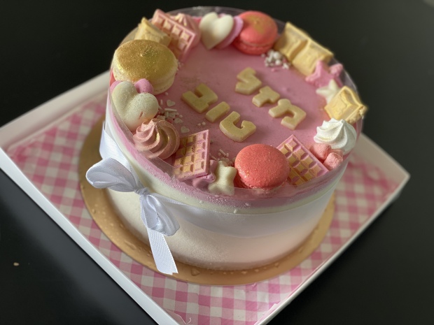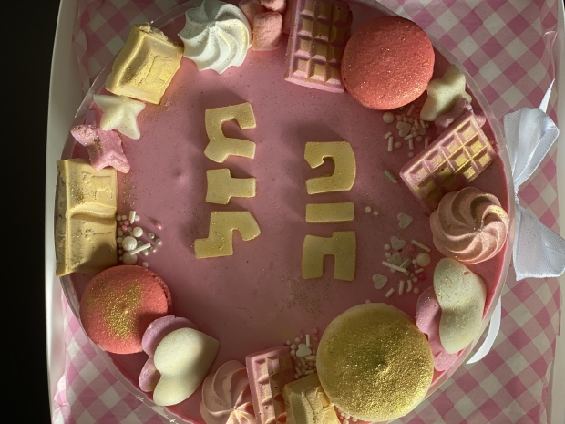 בציפוי שוקולד לבן (צבוע ורוד) ומלא שוקולדים, ממתקים, וקישוטים אכילים (עשויים להשתנות בהתאם למלאי)