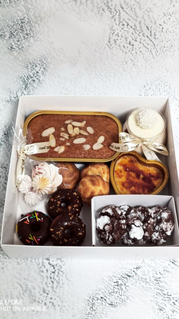 עוגת דבש קטנה, צנצנת מוס, קרם ברולה לב , 4 עוגיות מושלגות, 3 פחזניות, 3 מיני דונאטס, 5 נשיקות