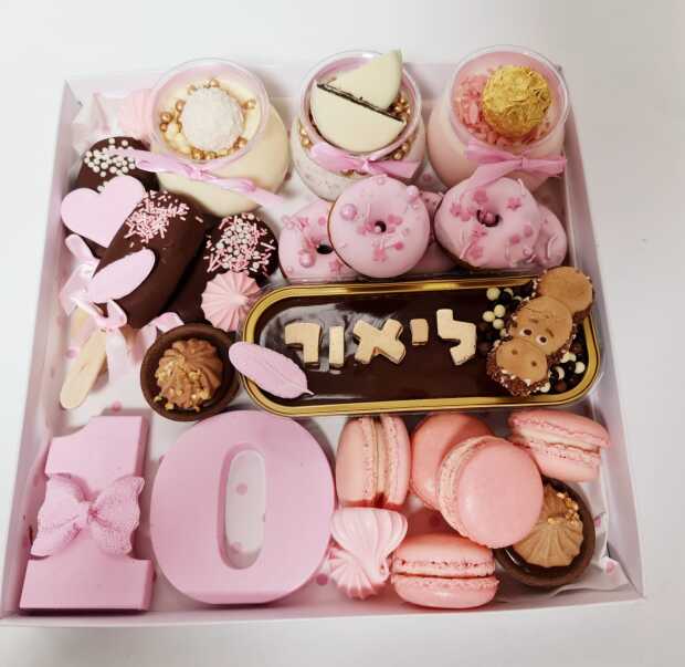 מארז הכולל מוסים בטעמים שונים ,מיני דונאטס, מקרונים, מיני מגנום העשוי מעוגת שוקולד.