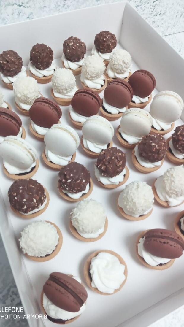 טארט שוקולד במילוי גנאש שוקולד , עם קצפת ופינוק מתוק מעל.