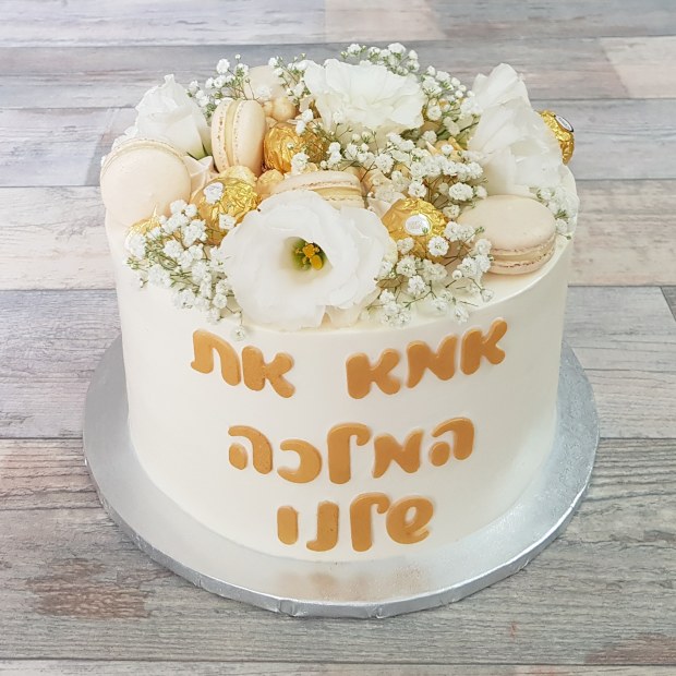 עוגת טורט מלאה בכל טוב מקושטת בפרחים, מקרונים, פררו רושה ונשיקות עבודת יד