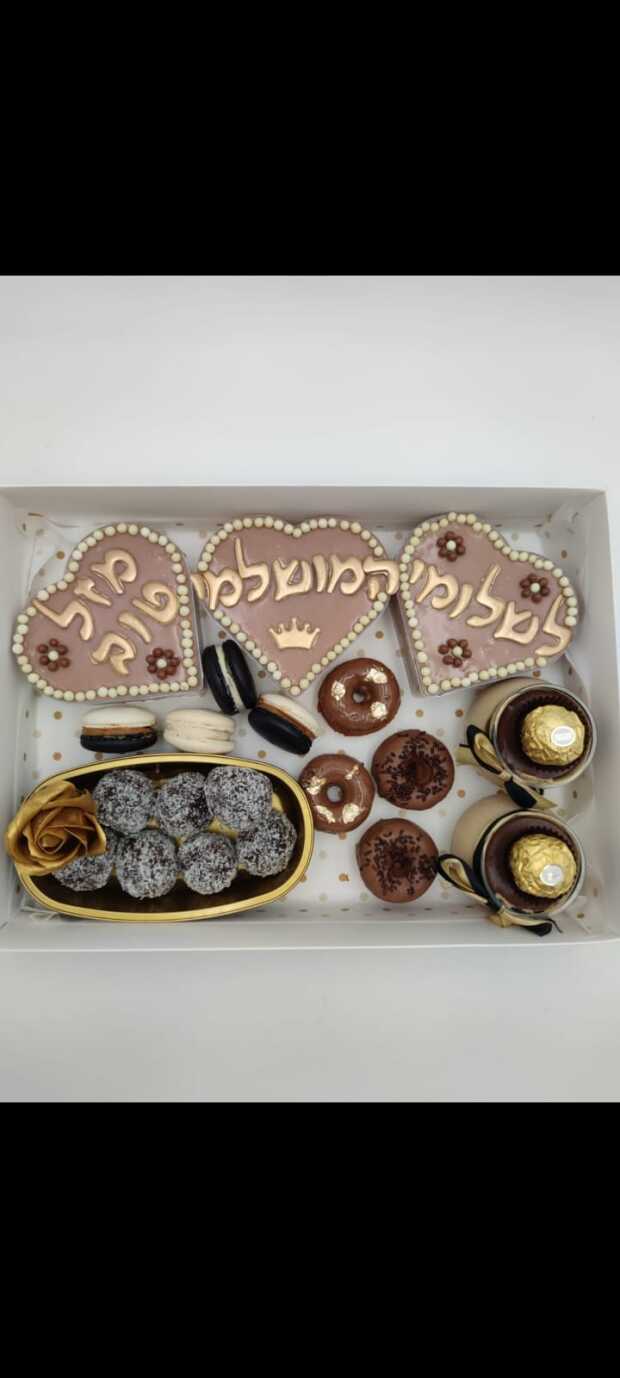 מארז מושחת המורכב ממוסים בטעמים לבחירה,כדורי שוקולד,דונטסים עם גנאש ושוקולדים ומקרונים