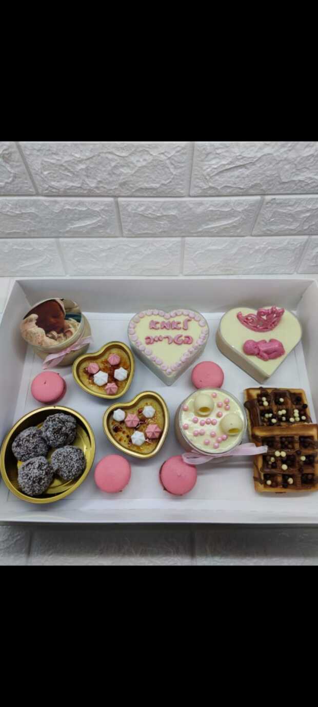 מארז מושחת המורכב ממוסים בטעמים לבחירה,וופל בלגי,קרם ברולה,מרונים וכדורי שוקולד