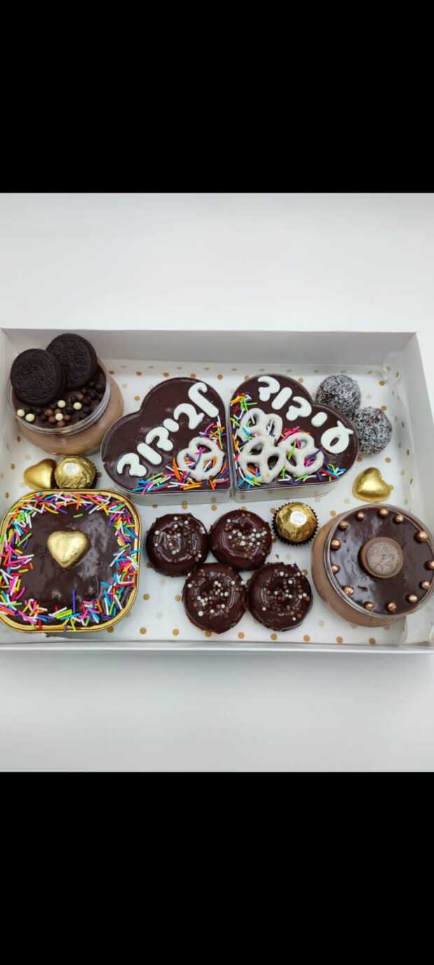 מארז המורכב ממוסים בטעמים לבחירה,דונטסים, כדורי שוקולד, ומיני עוגת שוקולד