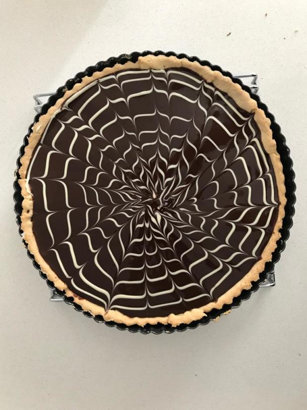 בצק פריך עם שוקולד מרירי מעולה 70 מוצקי קקאו, עם שברי עוגיות וקישוט שוקולד לבן