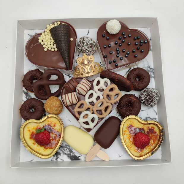 מארז המכיל 3 מוסים בטעמים לבחירה, 2 קרם ברולה, 2 מגנומים, 4 דונאטס, 2 כדורי שוקולד ו2 כדורי לוטוס