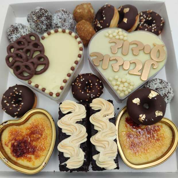 מארז המורכב מ2 מוסים בטעמים לבחירה,2 קרם ברולה, 2 חיתוכיות שוקולד,6 דונאטס,4 כדורי שוקולד ו 2 כדורי לוטוס