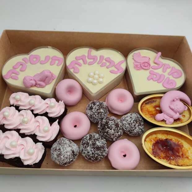 מארז המכיל 3 מוסים בטעמים לבחירה,2 קרם ברולה, 3 חיתוכיות שוקולד עם קצפת, 4 דונאטס ו5 כדורי שוקולד