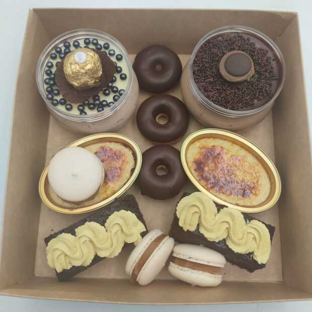 מארז המכיל 2 מוס צנצנת, 2 קרם ברולה, 2 חיתוכיות שוקולד עם קצפת, 3 מקרונים ו3 דונאטס