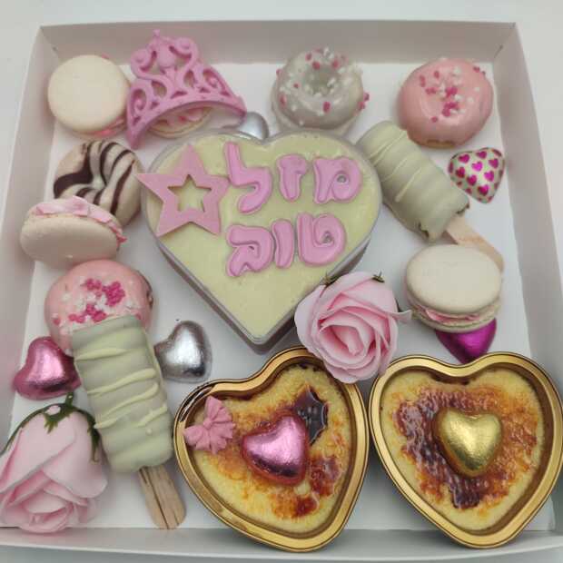 מארז המכיל מוס 1 בטעם לבחירה, 2 קרם ברולה, 2 מגנומים,4 דונאטס ו4 מקרונים