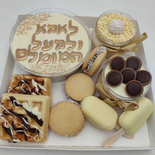 מארז המכיל מוס ענק, 2 מוסים בינוניים, 2 מגנומים, 3 אלפחורס וזוג וופל בלגי ♥