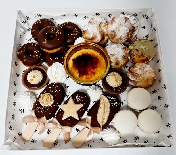 מארז הכולל: מיני דונאטס, פחזניות במילוי קרם וניל, טארט קרמל גנאש שוקולד וקציפת קפה,מקרונים , מיני מגנום (העשוי מעוגת שוקולד טעימה),נשיקות, קרם ברולה