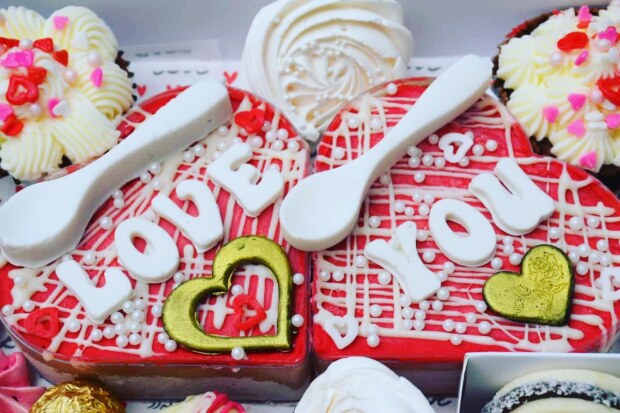 המארז כולל מוס שוקולד לבבות , כיתוב לבחירה , אלפחורס , כדורי שוקולד , וקאפקייקס