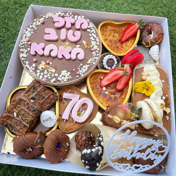 מארז חגיגי הכולל מוסים, קרם ברולה, עוגת שוקולד, ומגוון קינוחים קטנים מסביב