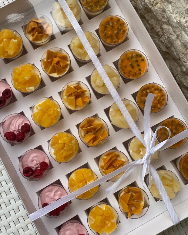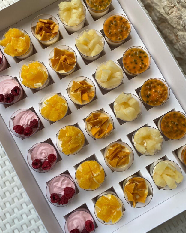 עם תחתית של ביסקוויט עם חמישה טעמים של מוסים בטעמים פסיפלורה אננס מנגו תפוז ופטל
