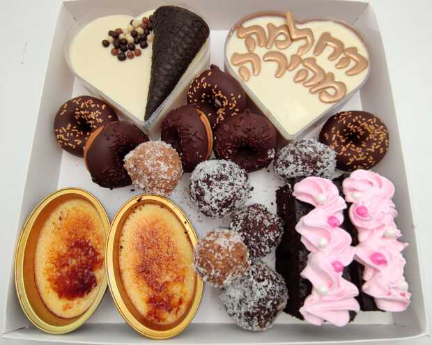 מארז המכיל 2 מוסים בטעמים לבחירה, 2 קרם ברולה, 2 חיתוכיות שוקולד, 6 דונאטס, ו 6כדורים בטעמים משתנים