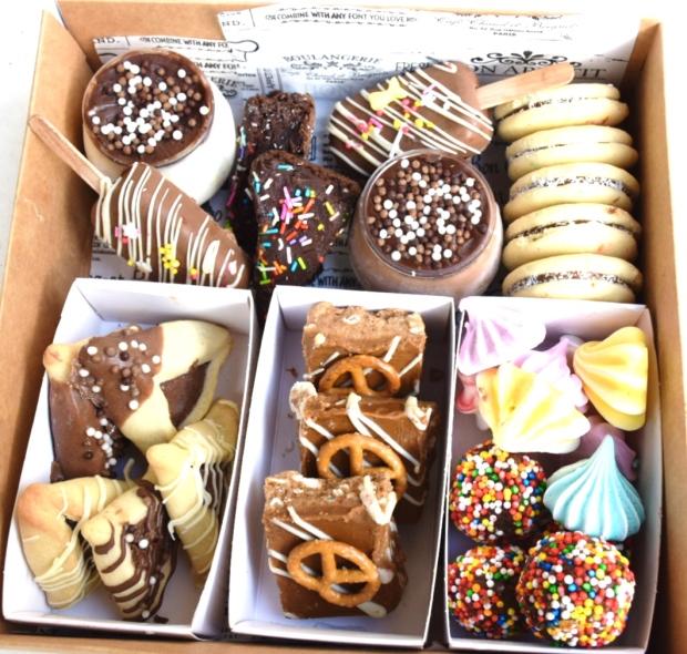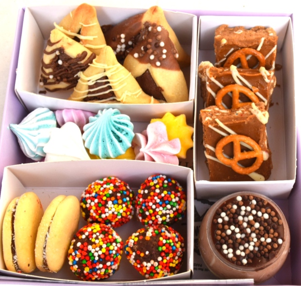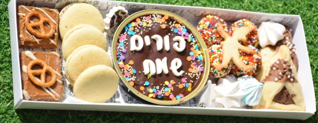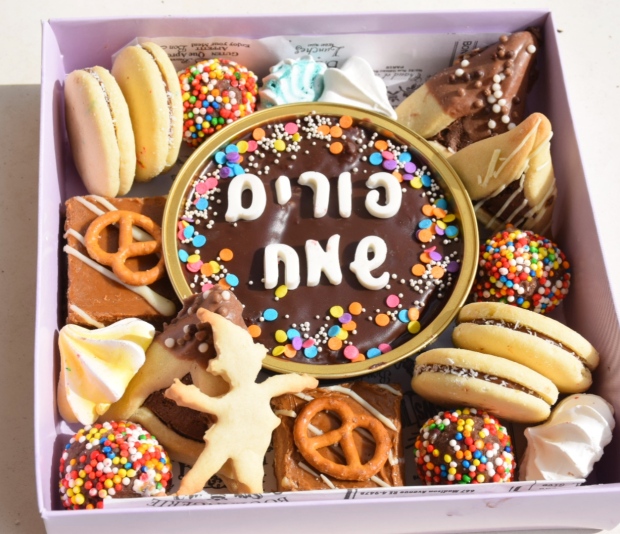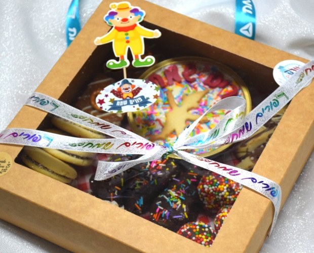 המארז מכיל : אזני המן , חיתוכיות בייגלה לוטוס, עוגת פורים שמח, כדורי שוקולד, אלפחורס, נשיקות , עוגיית הליצן השמח
