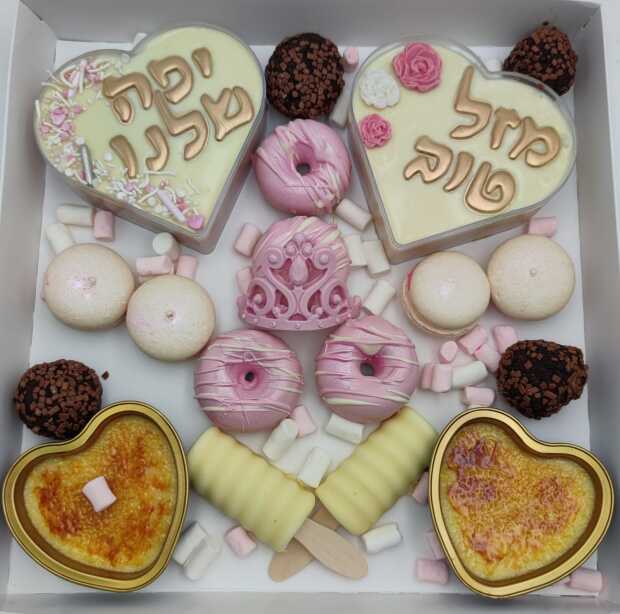 מארז המכיל 2 מוסים בטעמים לבחירה,2 קרם ברולה, 2 מגנומים,4 דונאטס מצופים שוקולד, 4 כדורי שוקולד ו4 מקרונים