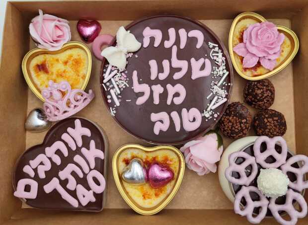 מארז מושחת המכיל מוס 1 ענק, 2 מוסים בינוניים,3 קרם ברולה ו3 כדורי שוקולד