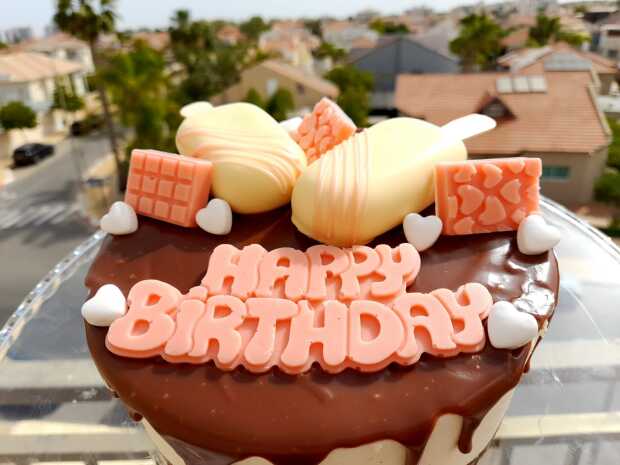 שכבת קראנץ נוגט, מעליה מוס וניל עשיר במרקם מושלם, ומעל גאנש שוקולד וקישוטים מיוחדים.
