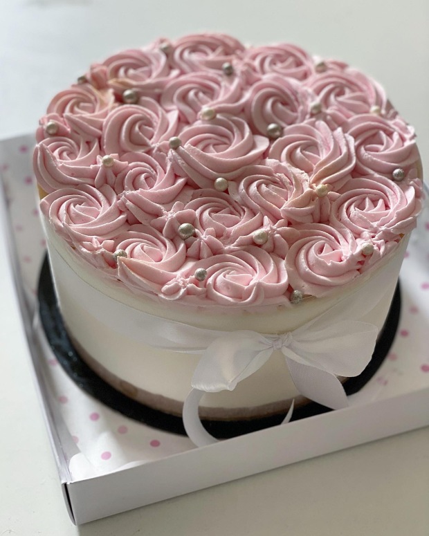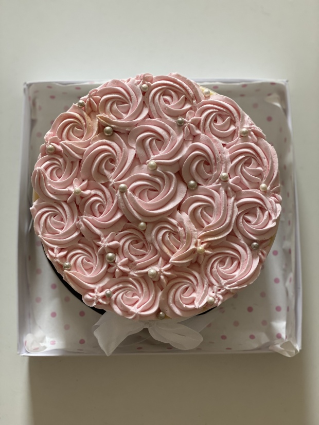 גנאש שוקולד לבן מעל, וזילוף קרם וניל ורוד (ניתן לשינוי צבע)