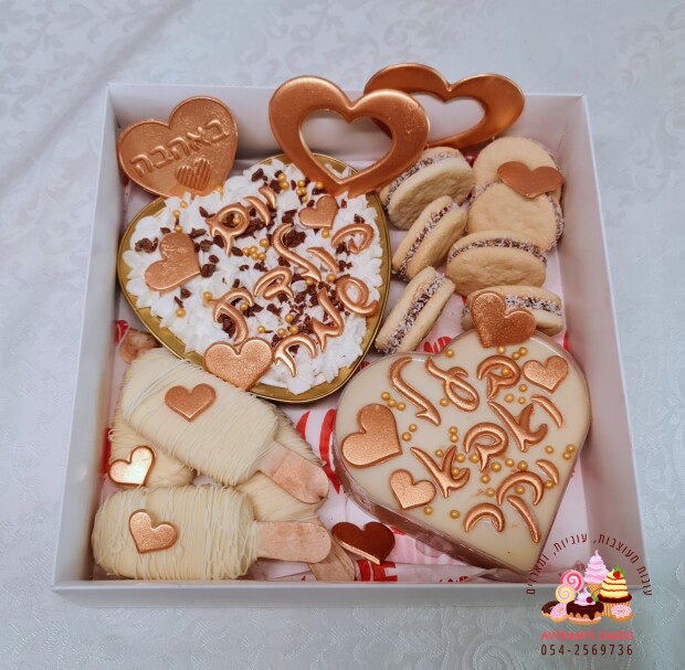 מארז המכיל: מוס פררו רושה, עוגת גבינה אפויה, אלפחורס, מגנומים וקישוטי שוקולד