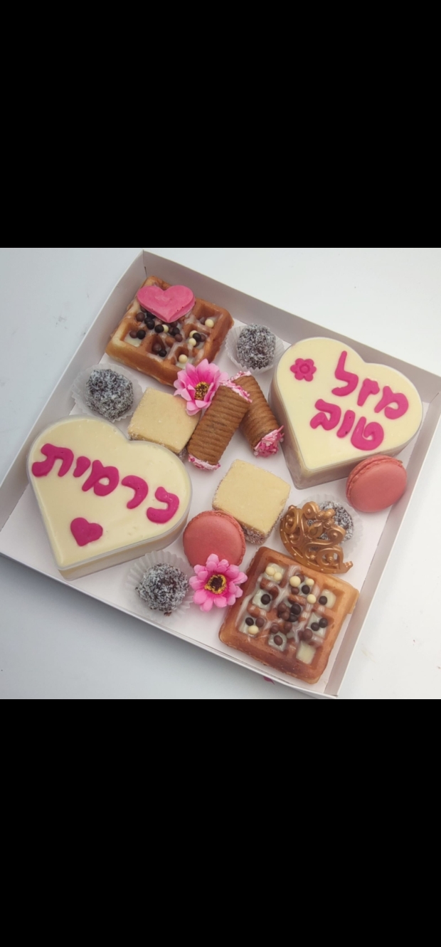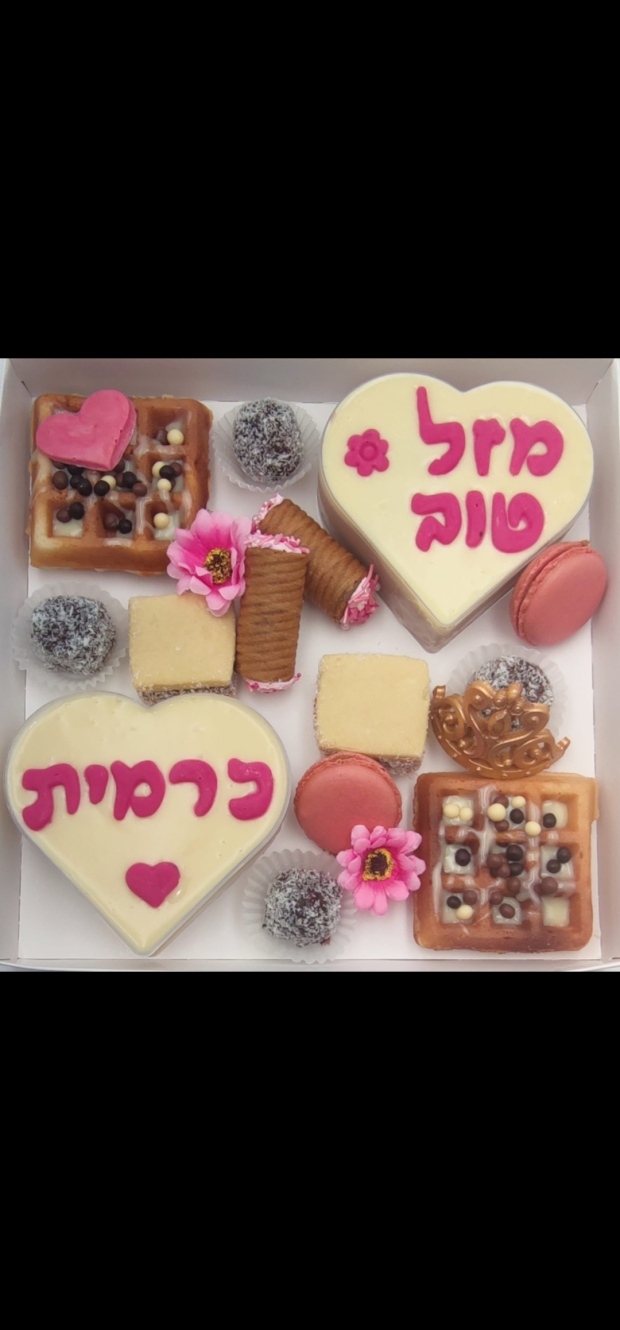 מארז המכיל מוסים בטעמים לבחירה, וופל בלגי עם שוקולדים,