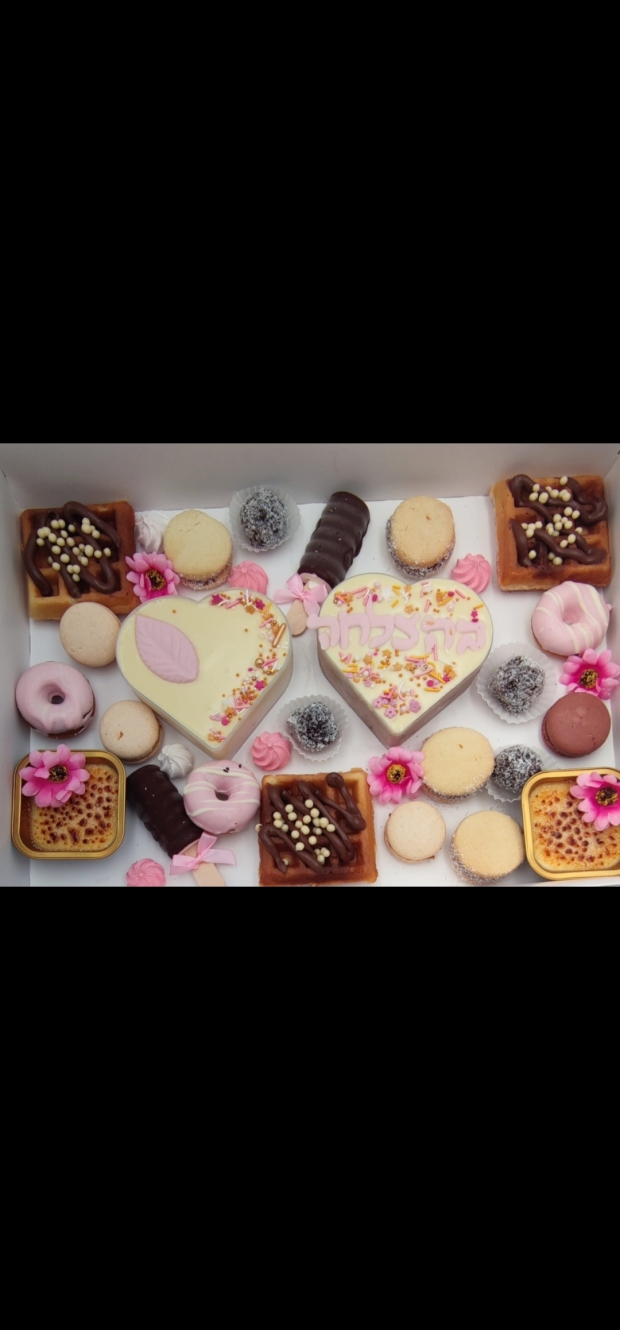 מארז המכיל- מוסים בטעמים משתנים,ופל בלגי עם שוקולודים, קרם ברולה, מיני מגנומים, דונאטס מצופה שוקולד, כדורי שוקולד, אלפחורס, מקרונים ועוד..♥