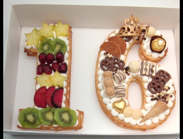 עוגת בצק פריך מספרים מושחת וחמאתי עם קצפת טעימה, פירות טריים וושוקולדים מושלמים,