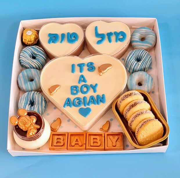 מארז המכיל: עוגת גבינה קרה, מוס פררו רושה, מוס קינדר, עוגיות אלפחורס ודונאטסים.
