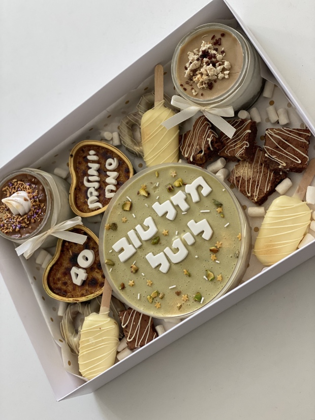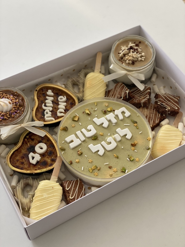 מגוון של קינוחי מוס, צנצנות, קרם ברולה, מגנומים עבודת יד, בייגלה מצופה, ובראוניז
