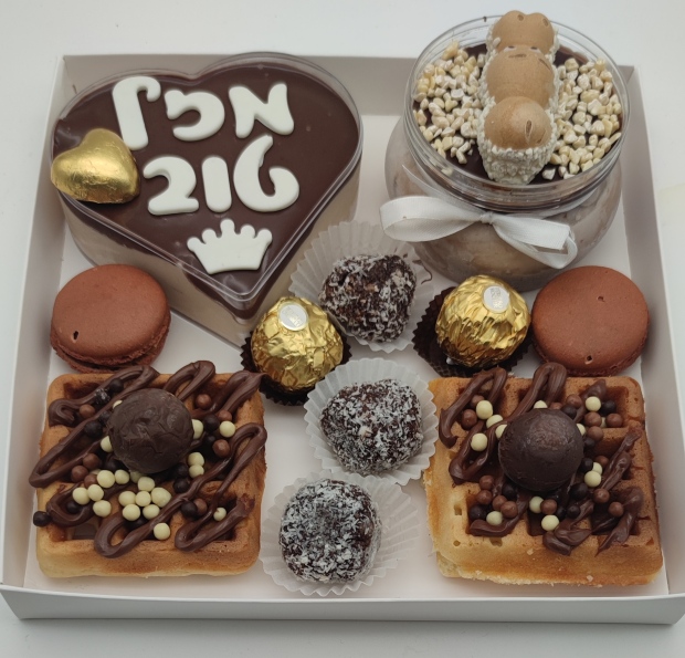 מארז מושחת המכיל מוסים בטעמים משתנים,כדורי שוקולד, וופל בלגי עם שוקולד ועוד... ♥