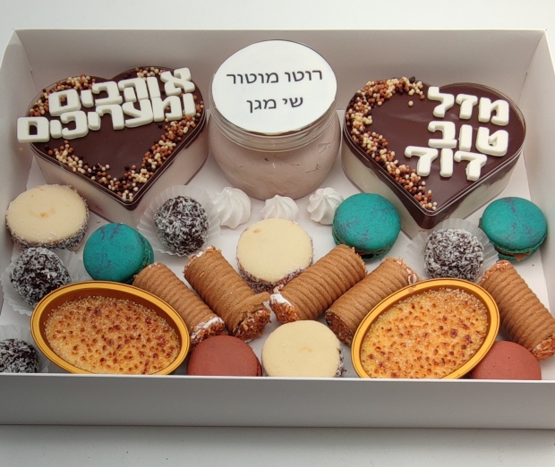 מארז מושחת המכיל מוסים בטעמים משתנים,קרם ברולה, כדורי שוקולד ועוד...