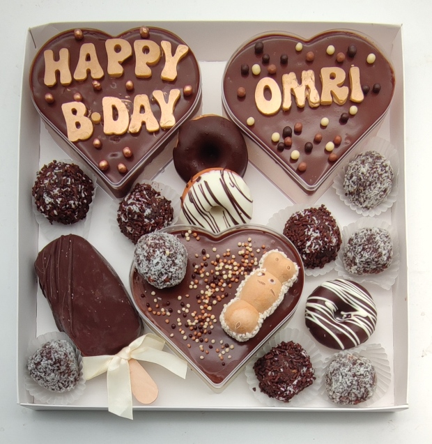 מארז המכיל מוסים בטעמים משתנים,מגנום, כדורי שוקולד ודונאטס עם שוקולד