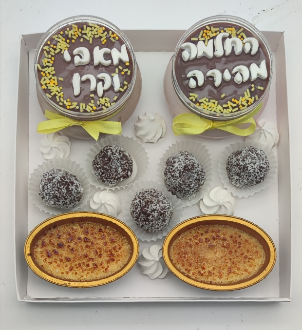 מארז קינוחים מושלם המכיל מוסים בטעמים משתנינם, קרם ברולה וכדורי שוקולד