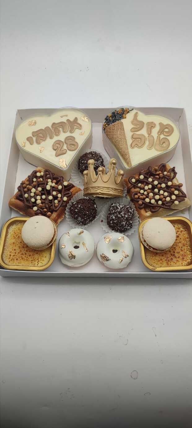 מארז מושלם המכיל מוסים בטעמים שמתניפ, קרם ברולה, דונאטס עם שוקולד ,כדורי שוקולד וופל בלגי עם שוקולד
