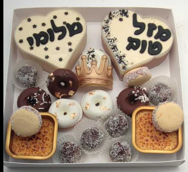 מארז המכיל מוסים בטעמים משתנים, קרם ברולה, כדורי שוקולד, דונאטס מצופה שוקולד ואלפחורס ♥