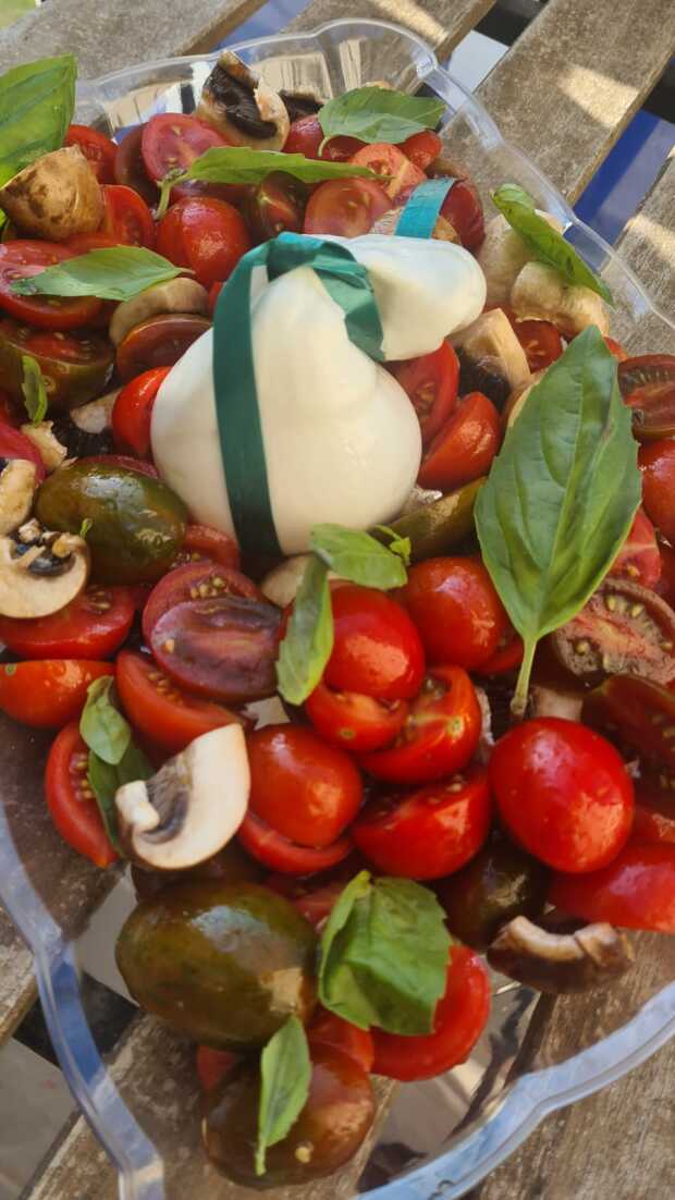 מכיל עגבניות שרי ציבעוניות, גבינת בוראטה גדולה, פטריות טריות, ועלי בזילקום.